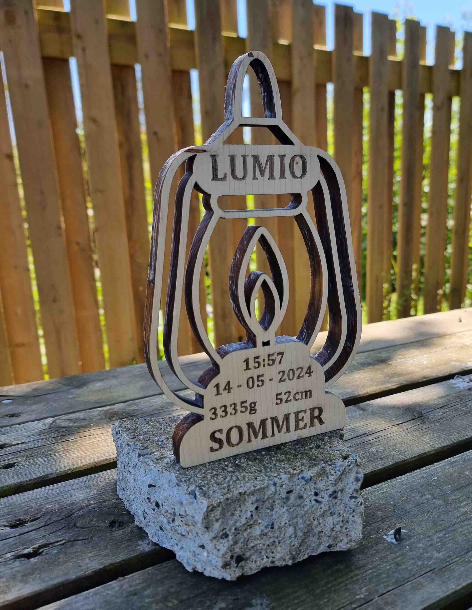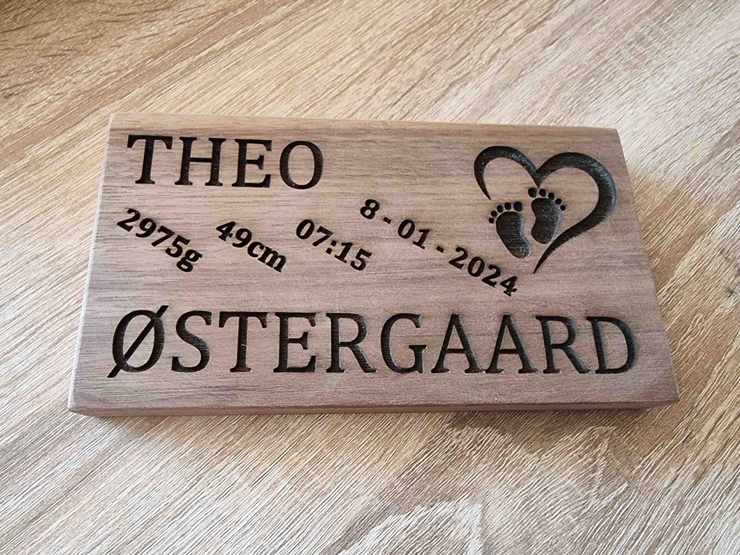 Denne smukke dåbstavle i træ er en helt særlig måde at forevige et barns fødsel på. Tavlen laves i 3 mm træ (birk eller andet træ efter ønske) og graveres med barnets vigtigste oplysninger – fx navn, fødselsdato, tidspunkt, vægt og længde.